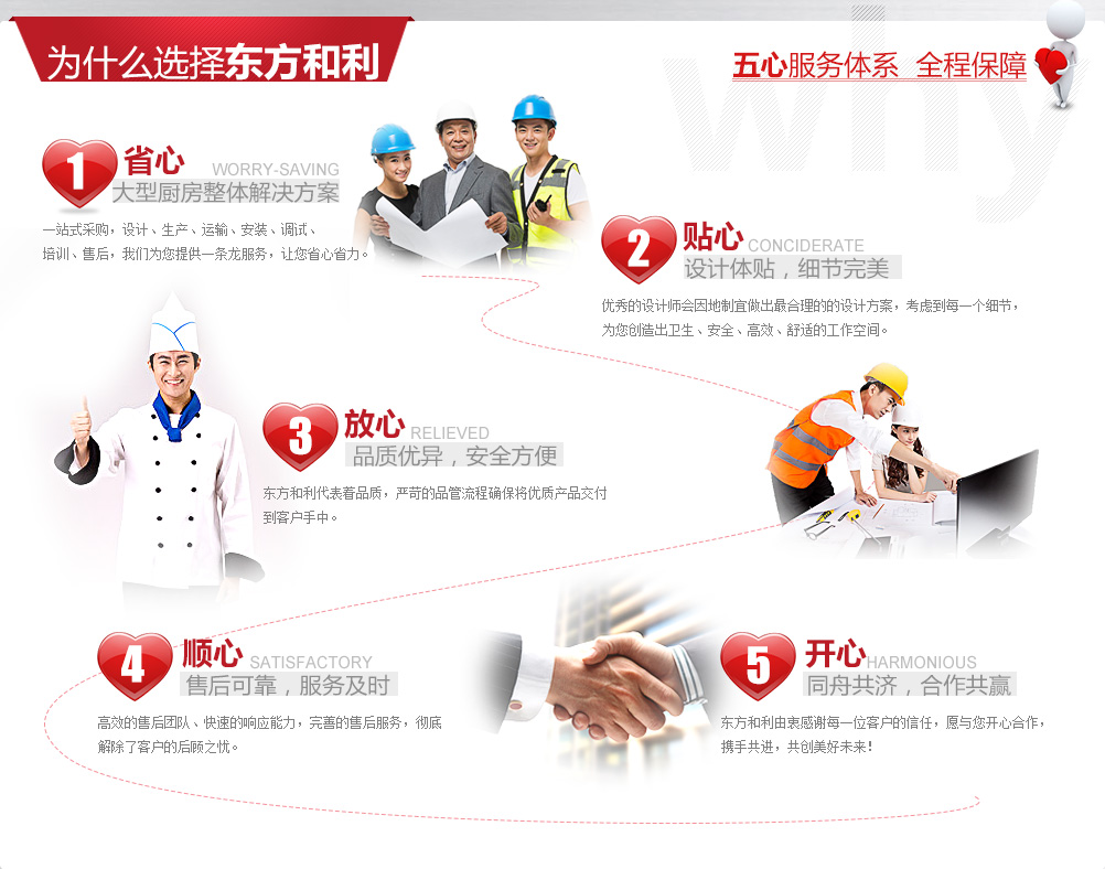 沈陽東方和利廚業(yè)有限公司,是一家業(yè)務(wù)覆蓋全國的廚房設(shè)備制造商及商用廚房系統(tǒng)集成服務(wù)商,致力于為廣大用戶提供高品質(zhì)的廚房設(shè)備和完善的工程服務(wù)。 與傳統(tǒng)的"生產(chǎn)商"或"銷售商"不同,東方和利并不僅僅生產(chǎn)或銷售廚房設(shè)備,而是為客戶提供廚房整體解決方案的"服務(wù)商"。我們以客戶需求為中心,采用"五心"服務(wù)體系全程保障,為客戶提供廚房設(shè)計(jì)咨詢、設(shè)備生產(chǎn)、運(yùn)輸、安裝、調(diào)試、培訓(xùn)、售后等全套服務(wù),讓您體驗(yàn)到管家式服務(wù)的周到與便利。 東方和利憑借質(zhì)量和服務(wù)優(yōu)勢,在全國各大廚房工程招標(biāo)中不斷中標(biāo),客戶涵蓋了單位食堂(企業(yè)、政府機(jī)關(guān)、部隊(duì)、學(xué)校、醫(yī)院)、星級酒店、餐飲、中央廚房、團(tuán)膳配餐等多種類型。 我公司同時(shí)代理多種名牌食品機(jī)械、酒店用品,為客戶提供"一站式"商用廚具整體解決方案。我們秉承"質(zhì)量第一,信譽(yù)至上"的原則,希望能在不久的將來為您提供優(yōu)質(zhì)的產(chǎn)品和服務(wù)!